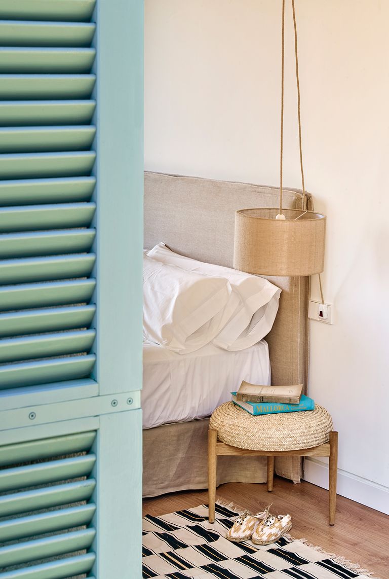 Обычная маленькая полочка, крепящаяся к стене, — отличный вариант для маленькой спальни. Под нее можно класть тапочки или поставить плетеную корзину для хранения всяких полезных мелочей вроде любимой книги или зарядки для телефона.
