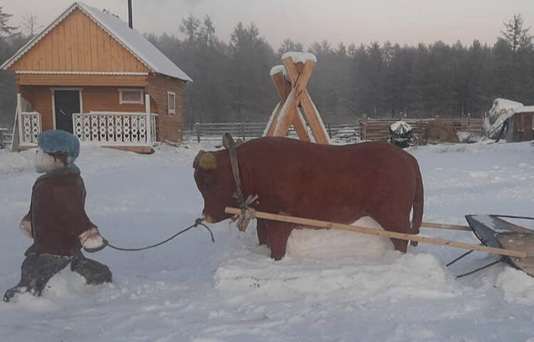 Снежная скульптура мальчика в маске, ведущего за собой быка с повозкой, установлена в селе Дикимдя Нюрбинского улуса.