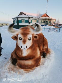 А в Мугурдахском наслеге Абыйского улуса мастер Виктор Новиков ежегодно радует жителей своими снежными скульптурами. В этом году мужчина слепил очаровательного бычка.