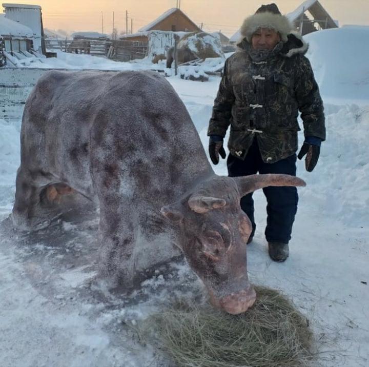 Настоящего якутского быка создал из снега житель села Болугур Амгинского улуса Октябрь Аянитов.