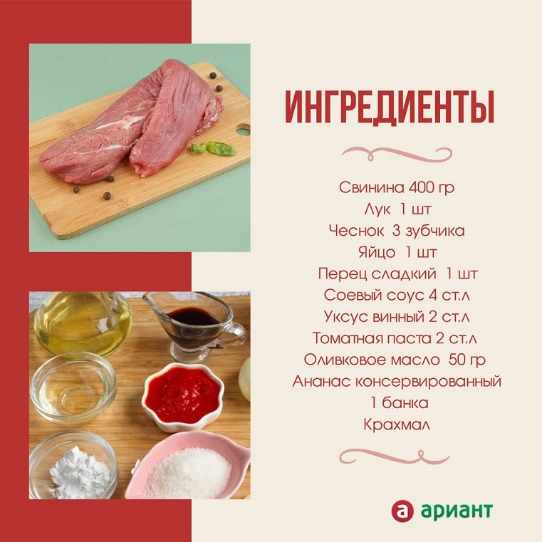 Для приготовления блюда подходит свинина. Желательно, чтобы это было мясо молодого животного с розовым цветом без прожилок. Такое есть у агрофирмы «Ариант».