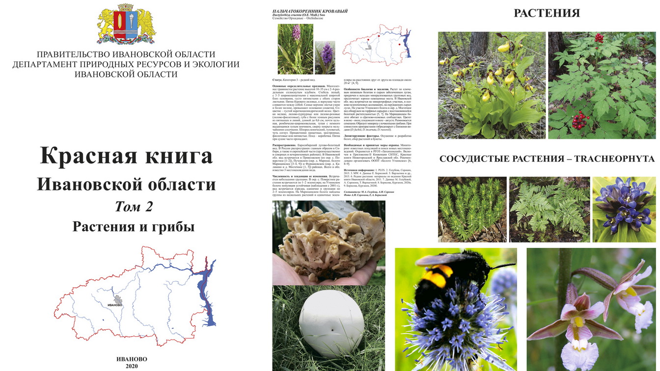Красная книга Ивановской области состоит из двух томов: «Животные» и «Растения и грибы». Первый том первоначально издан в 2007 году, переиздан в 2017 году. Второй том увидел свет в 2010 году, переиздан в 2020 году. В течение десяти лет учеными велись исследования по изучению редких объектов растительного мира в различных районах Ивановской области, в том числе на особо охраняемых природных территориях.