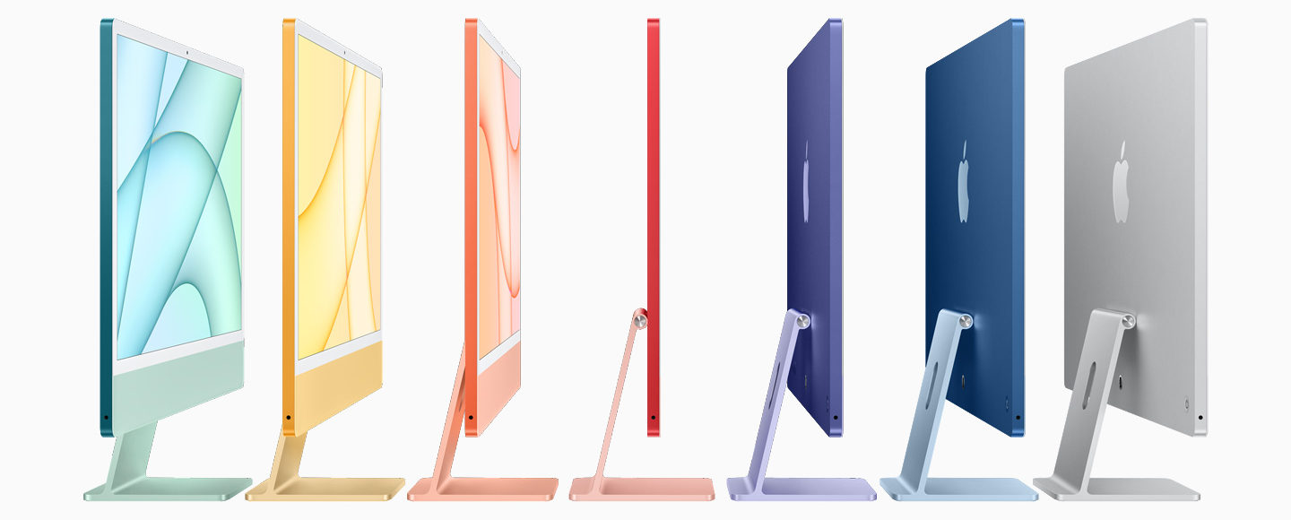 При этом iMac стал плоским и напоминает сильно выросший в размерах iPad Pro или iPad Air. Толщина устройства составляет всего 11,5 миллиметров. Но главное цвета. Всего появится 7 расцветок: синий, зеленый, розовый, желтый, оранжевый, фиолетовый и классический серебристый. У всех рамка вокруг дисплея — белого цвета, а черной версии не будет, как минимум пока.