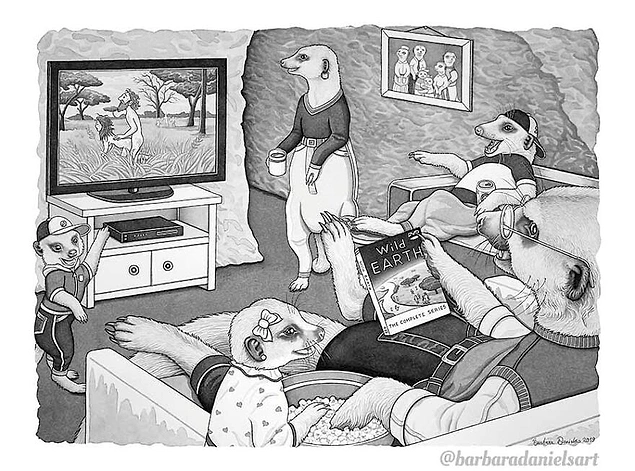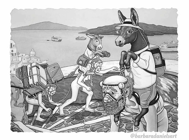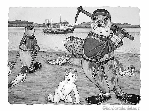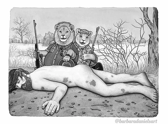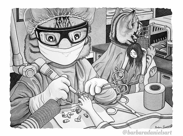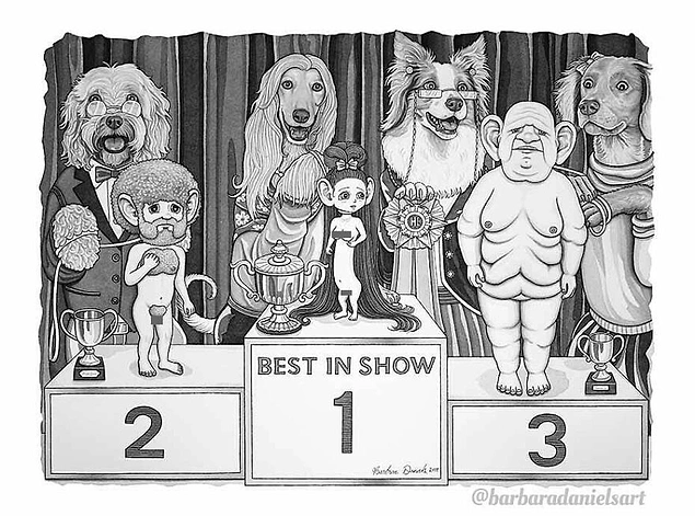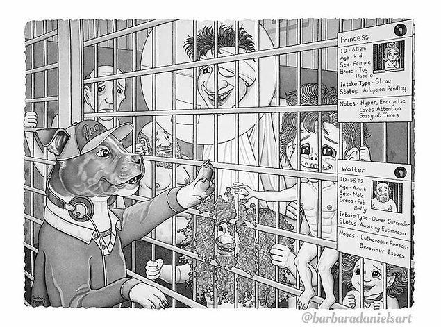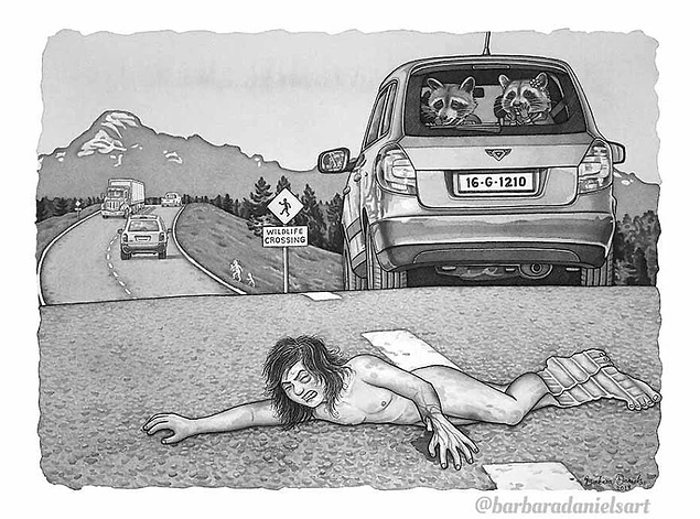 У Барбары Дэниелс есть призвание раскрывать эти темные вещи, которые делают люди. Она меняет точку зрения, меняя ролями людей и животных, что, в свою очередь, повышает нашу осведомленность о том, как мы ведем себя с другими животными, что в большинстве случаев является жестоким и неэтичным. У нашего вида есть много возможностей для роста. Ее иллюстрации - отрезвляющее напоминание о том, что наше общество далеко от совершенства.