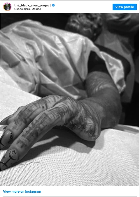 33-летний француз Энтони Лоффредо сделал серию пластических операций, чтобы выглядеть как «черный инопланетянин». А недавно парню ампутировали два пальца левой руки в рамках его проекта перевоплощения в инопланетянина. Заявив, что он завершил всего 34 процента запланированных процедур на своем теле, Лоффредо сказал, что его следующая цель - обрезать оба пальца на другой руке.