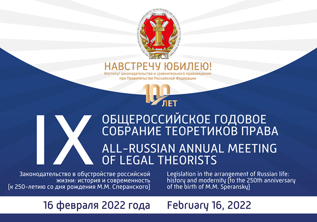 16 февраля 2022 г. в Институте законодательства и сравнительного правоведения при Правительстве Российской Федерации состоялось IX Общероссийское годовое собрание теоретиков права «Законодательство в обустройстве российской жизни: история и современность» к 250-летию со дня рождения М.М. Сперанского в формате международной конференции.