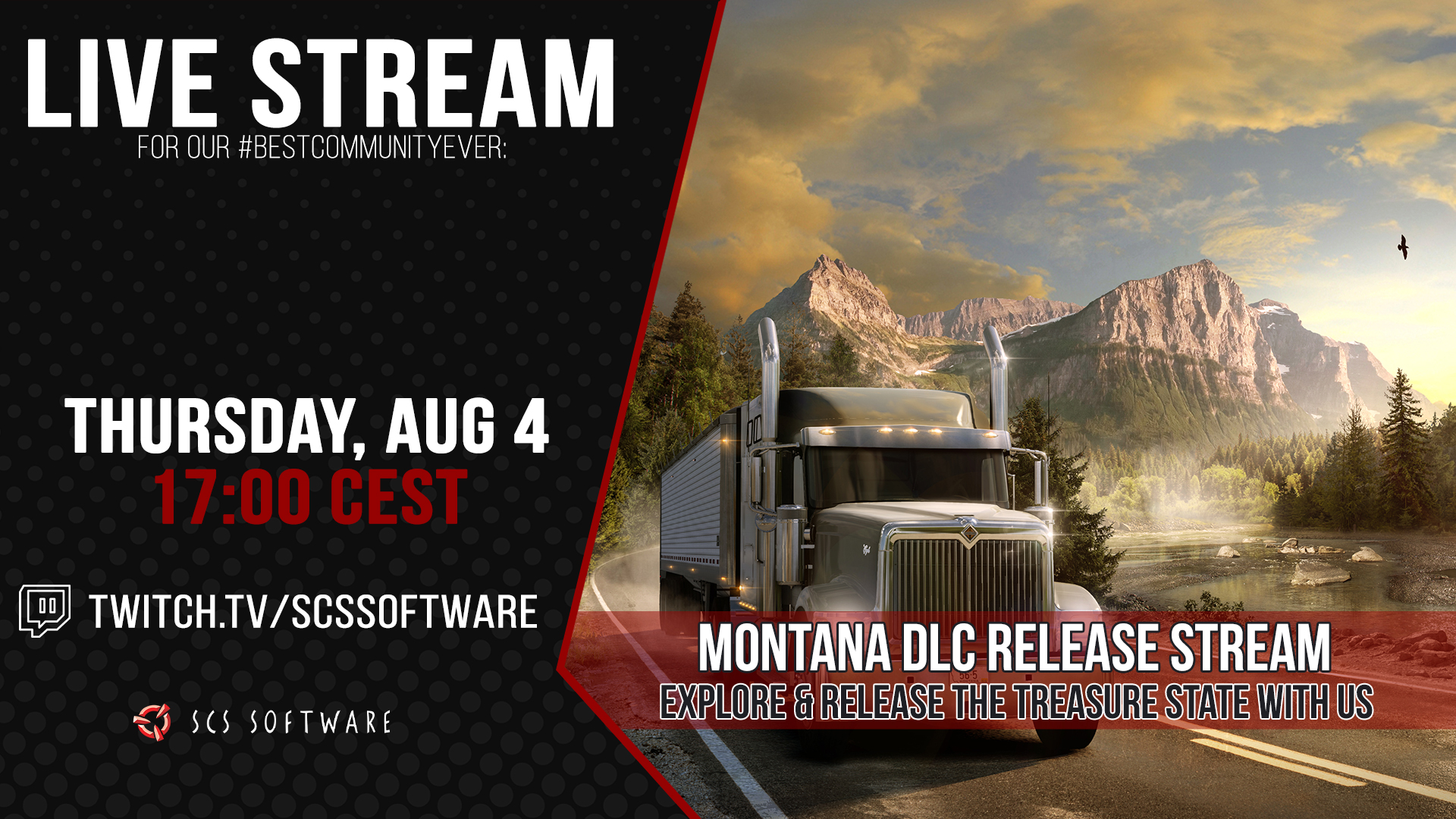 Мы также хотели бы пригласить вас на специальную прямую трансляцию выпуска Montana на нашем официальном канале Twitch, которая начнется в 18:00 по Москве. Не пропустите эту трансляцию: мы побеседуем с Давидо (руководителем DLC), а также со специальным гостем от Павла Шебора, генерального директора SCS Software! Мы будем отвечать на вопросы сообщества, подробно рассказывать о DLC, раздавать бесплатные ключи Steam для Montana и, конечно же, выпустим долгожданное расширение карты в прямом эфире!