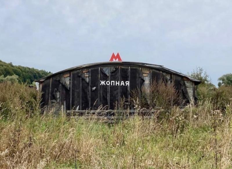 Как оказалось, это вовсе не мираж, и уж точно не реальный объект транспортной инфраструктуры. Станция «Жопная» – ни что иное, как новая инсталляция местного одиозного художника Вани Волкова. О его творчестве не раз сообщал и «Чехов Вид»: достаточно вспомнить обнажённую «невесту Гулливера» на протвинском карьере или всеми любимых советских мультгероев из снега.
