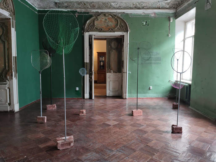 Алина Кугуш. Open Mo(u)th. 2022. Сачки, кирпич, кожа, нить, бумага, сухая игла. Фрагмент инсталляции на выставке «Как поймать мотылька?», 3 сентября — 26 ноября 2022. Музей Набокова, Санкт-Петербург. Фото: Артгид