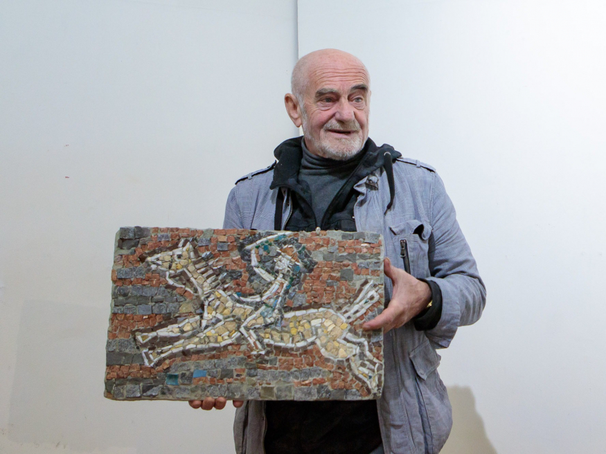 А еще на выставке представлена огромная композиция «Сотворение мира». Она сложена из квадратов. На плитках — мозаичные изображения созданных Богом птиц, рыб, земноводных, животных и, наконец, мужчины и женщины. Они перемешиваются с тем, что изобрел человек: от колеса и велосипеда — до самолета и мобильного телефона. Панно устроено так, что к нему можно с разных сторон добавлять новые квадраты с новыми картинками, а это значит, что даже если над «Сотворением мира» работать всю жизнь, оно не будет закончено никогда…