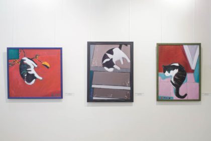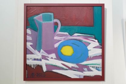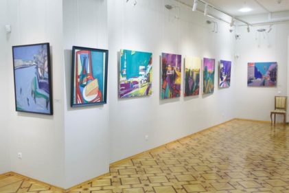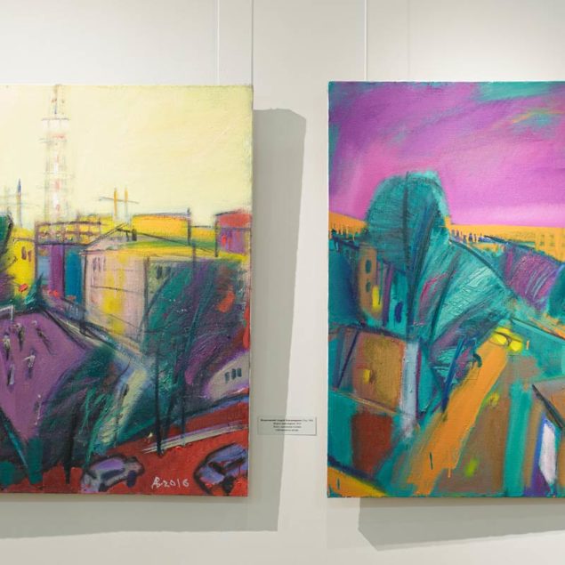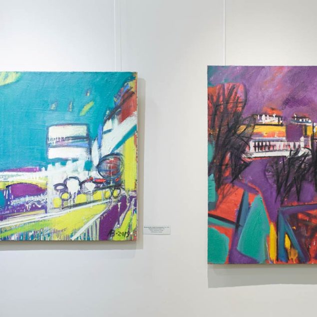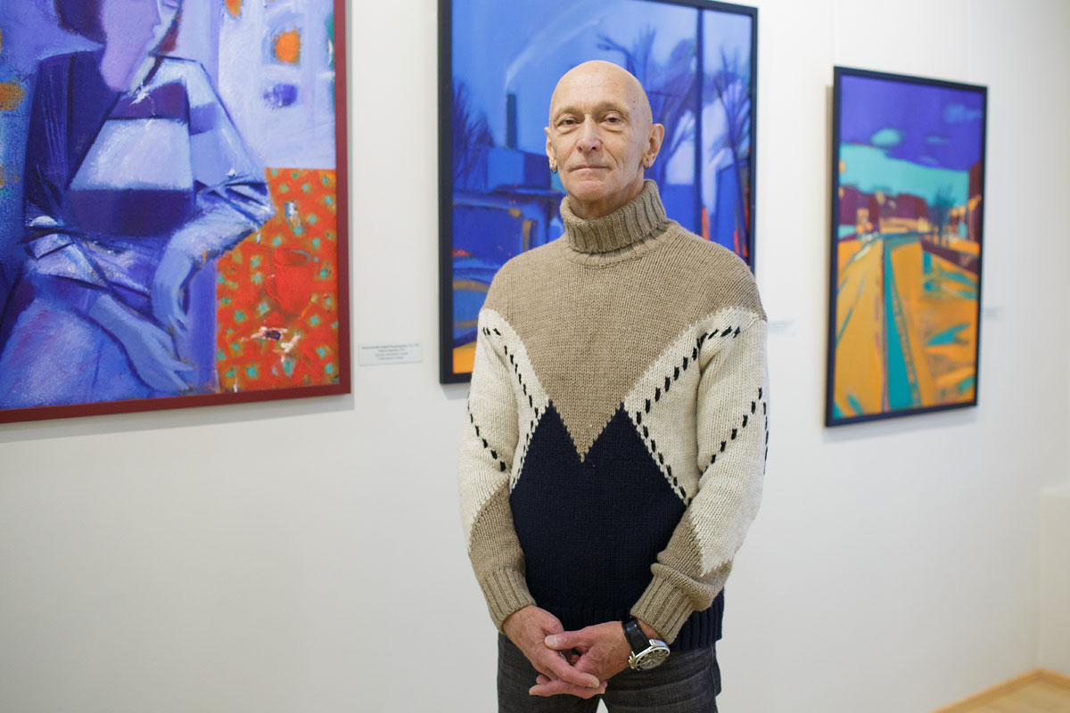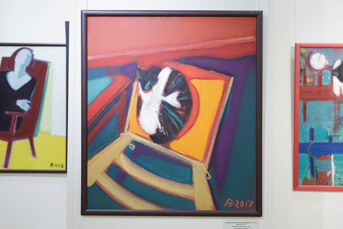 Нам повезло попасть на авторскую экскурсию по выставке, включающей живописные работы разных лет. Здесь есть и портреты (в том числе кота), и пейзажи, и натюрморты. Живопись художника очень эмоциональная, экспрессия передается через активный цвет, художественную геометрию с линиями, углами и закруглениями. Даже названия работ нередко отражают не описание изображенного, а состояние, которое было у автора в момент создания произведения.