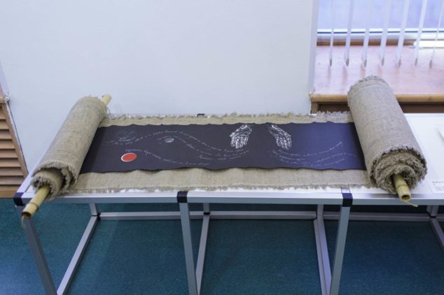Кроме этого объекта, на выставке можно увидеть различные типы книги художника. Это книги-свитки, это книги-объекты, книги-листы. Синтетическое искусство позволяет соединять живопись с поэзий, с музыкой, включать в себя объекты разной фактуры.