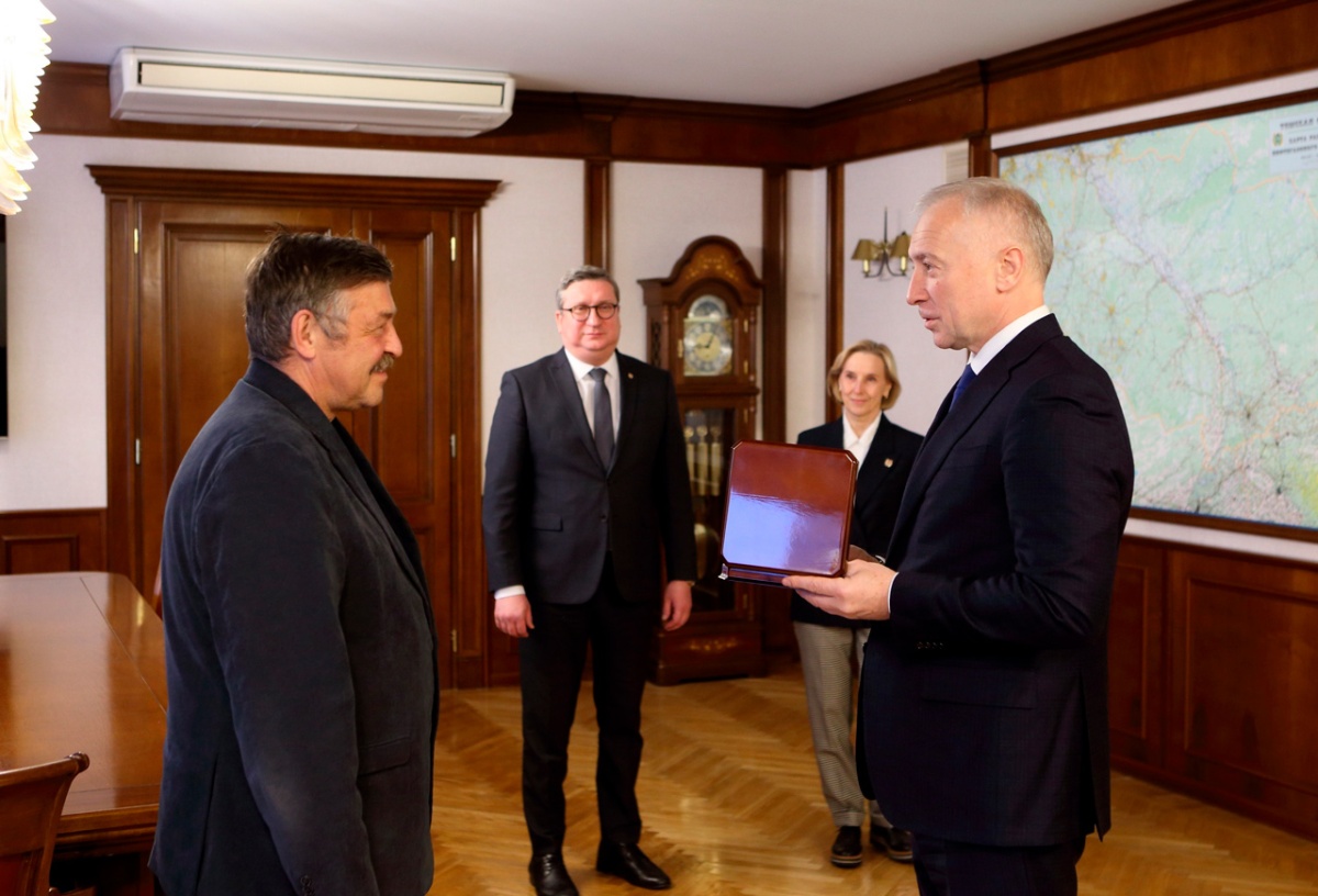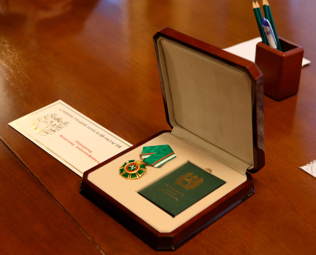 Губернатор Томской области Владимир Мазур вручил специальному представителю по международным и научно-техническим проектам Госкорпорации «Росатом» Вячеславу Першукову орден «Томская слава».