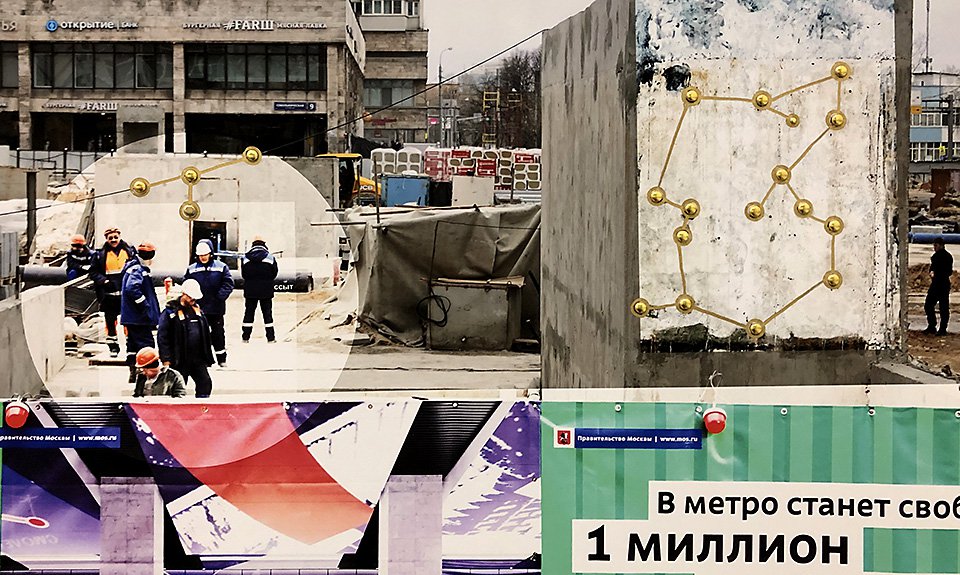 В какой-то момент, совершенно внезапно, на снимках появляются золотые узоры, напоминающие то ли созвездия, то ли соединенные точки на схеме метро, то ли даосские диаграммы из «Книги перемен», а сами «высвечивания» усложняются, превращаясь в какие-то внеземные объекты, зависшие в небе над Москвой. Ты будто получаешь галлюцинаторный опыт от длительного всматривания в одну точку. Эти явления-галлюцинации производят, вероятно, тот же эффект, что и внезапное появление двух человеческих фигур на противоположном краю пустого заснеженного поля в первой, хрестоматийной акции КД «Появление».