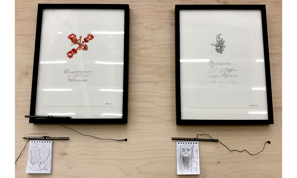 Под каждым из графических листов художница прикрепила блокнот и карандаш, чтобы зрители могли записать собственные соображения насчет увиденного. Но, реагируя на актуальную ситуацию, в которой возможность свободного высказывания затруднена, она оставила карандаши незаточенными. Любопытно было наблюдать, как это препятствие преодолевали гости вернисажа: кто-то сумел обнаружить оставленную в зале точилку и заточить карандаш, а кто-то начинал, например, мять и сгибать листочки, чтобы сделать хоть что-то, не имея возможности оставить запись. «Неразборчивое», таким образом, тоже кажется в рамках выставки микромоделью кадэшных акций, предполагающих реакцию зрителя, а затем рефлексивные описания и комментарии.