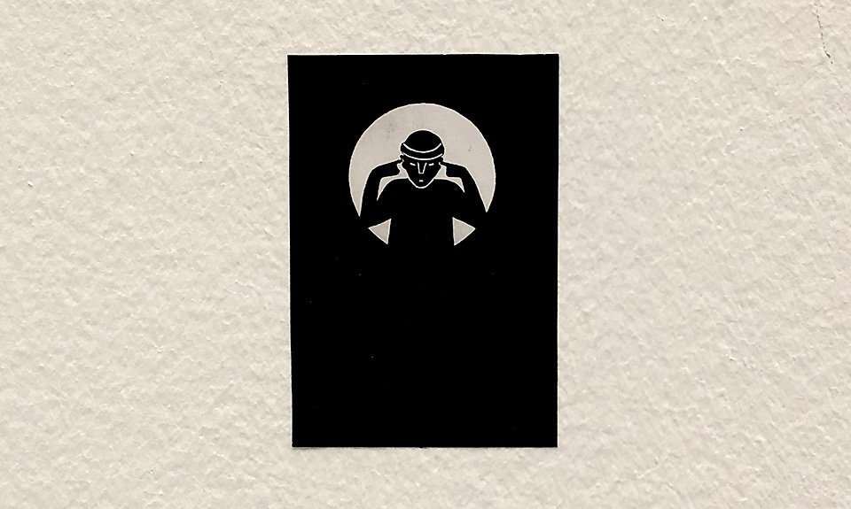 А чем-то вроде буддийского «иконостаса» для медитации, по словам художника, на выставке служат маленькие черные стикеры с изображением человечков: один смотрит на наручные часы, второй заткнул пальцами уши, третий высунул язык и так далее. Эти наклейки в точности повторяют паралингвистические щиты из акции «Юпитер» 1985 года, однако в то же время отсылают к практике стикер-бомбинга — современной форме уличного высказывания.