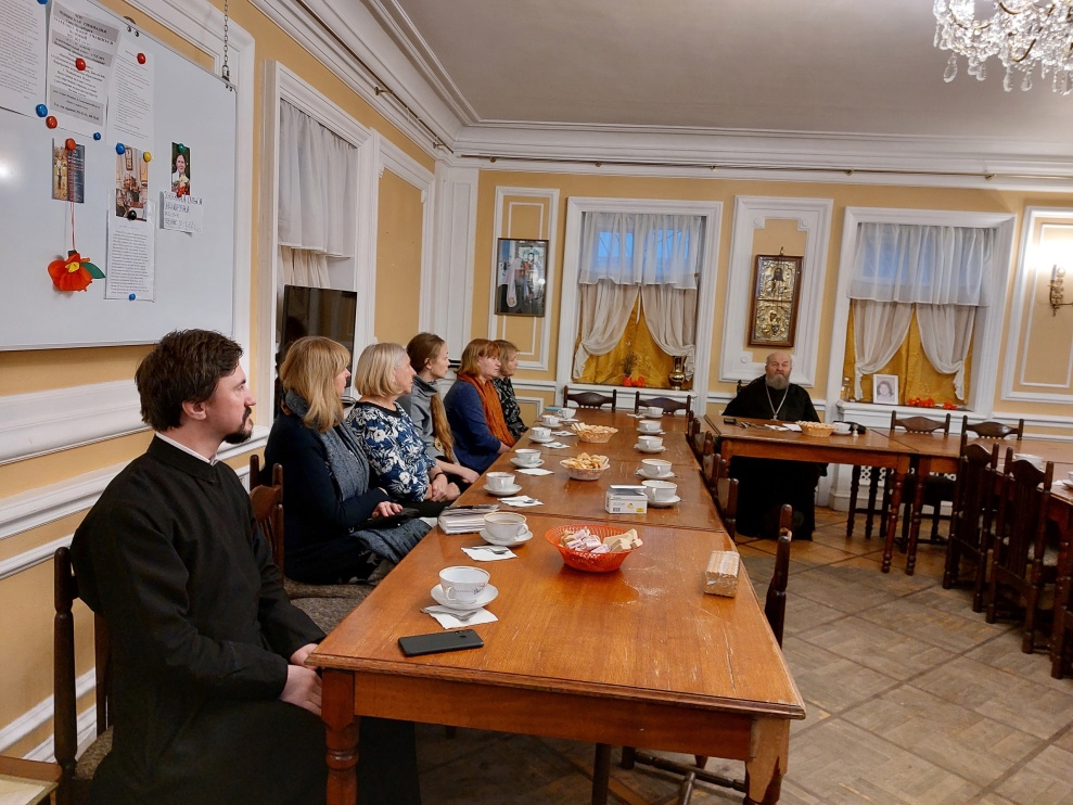 В начале встречи отец Владимир поприветствовал всех присутствующих и поведал о существующем историко-просветительском проекте, ориентированном на учителей и учащихся школ.«К настоящему времени одной из прихожанок собора, художником, матерью шестерых детей, сделана серия графических работ на тему «Храмы Петроградского района». В серию работ вошли акварельные зарисовки ныне действующих храмов района. Предполагается издание альбома художественных работ с текстами, повествующими об истории находившихся на картинках храмов. Альбом может стать пособием по истории Петроградского района для учителей и школьников», — сообщил Владимир.