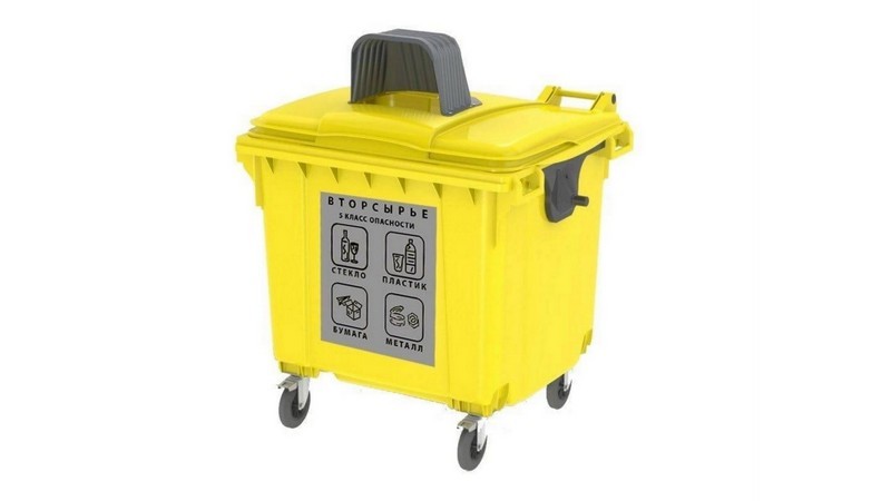 Такие контейнеры предполагают одновременный сбор пластика, бумаги, стекла и металла. Они имеют жёлтый цвет, крышку, колёса и специальную наклейку.