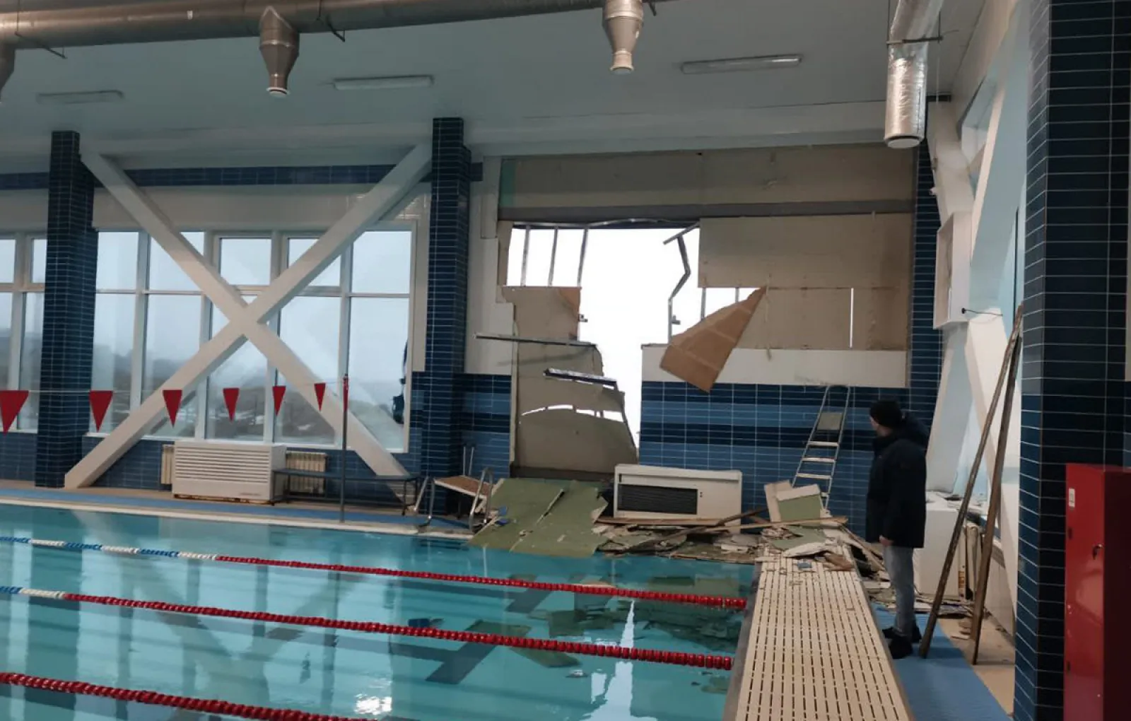 В Южно-Курильске на острове Кунашир штормовым ветром разнесло здание спортивной школы. Стихия снесла фасад бассейна. Повезло, что внутри никого в этот момент не было. По данным Telegram-канала Amur Mash, все произошло из-за того, что типовое строение, проект которого привезли из Москвы, для кунаширских штормов не предназначено.
