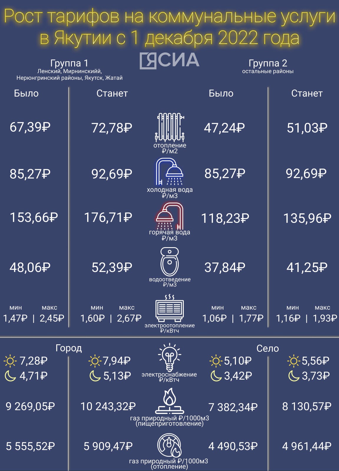 Напомним, председатель Госкомцен Якутии Антонина Винокурова объяснила, что рост платы за коммунальные услуги с 1 декабря не превысит для семей 11,4% при любом наборе коммунальных услуг, а в зависимости от состава услуг в целом может вырасти и меньше 9% для конкретной семьи. Но в среднем по республике уровень 9% должен быть выдержан.