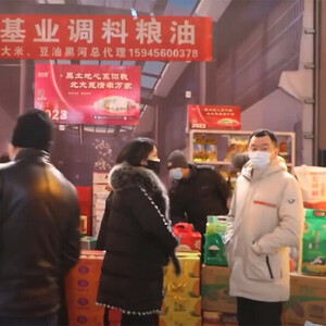 На улице стоят палатки с замороженными морепродуктами и замороженным мясом птицы, а внутри торгового центра продаётся сельскохозяйственная продукция городского округа Хэйхэ, праздничные коробки для новогодних товаров, парные полосы из красной бумаги с новогодними пожеланиями, календари и новогодние картинки.