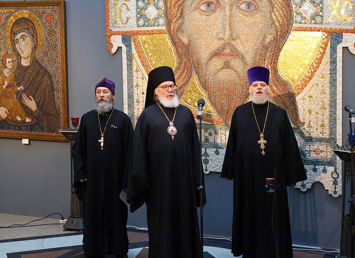 В экспозиции представлены проекты храмов, иконы, мозаика, изделия из керамики и дерева, церковная утварь, шитье, облачения и др.