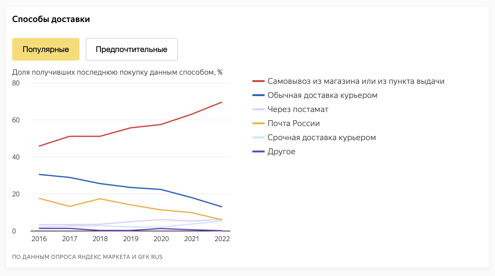 Чаще всего пользователи забирают заказы самостоятельно из пункта выдачи или постамата — так получают заказы 76% опрошенных. На втором месте — курьерская доставка (12%), а почтой и срочной курьерской доставкой пользуются примерно одинаково нечасто — в 5–6% случаев.
