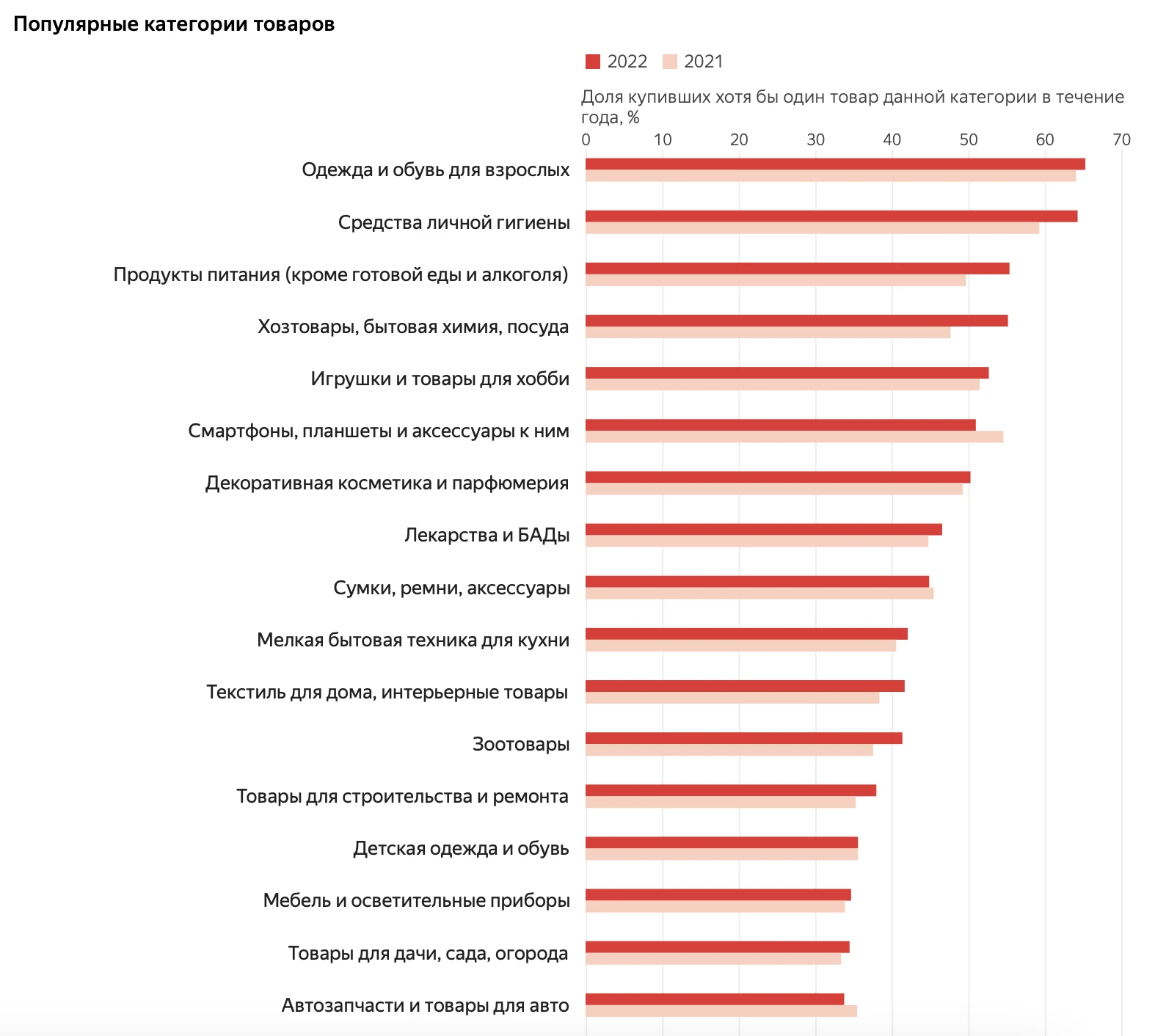 Самая популярная категория товаров — одежда и обувь для взрослых, хотя бы раз в год эти товары покупали более 65% респондентов. На втором месте расположились средства личной гигиены (64%), а на третьем — продукты питания (55%).