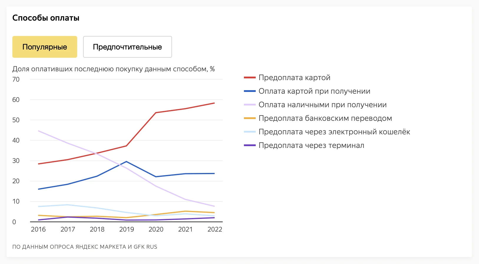 Наиболее распространённым способом оплаты стала банковская карта при оформлении заказа. Оплата при получении находится на втором по популярности месте. Актуальность оплаты наличными при получении, банковским переводом или через терминал стремится к нулю.