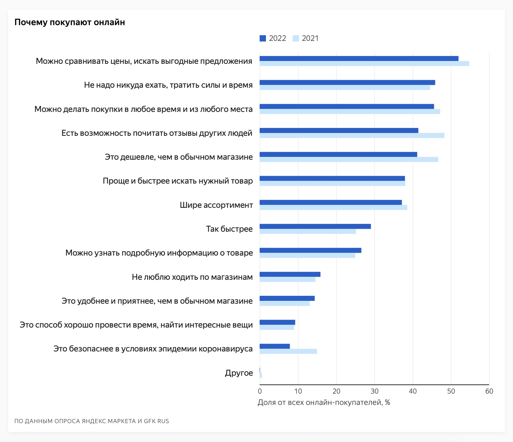 Покупки в интернете люди выбирают потому, что можно сравнивать цены и искать выгодные предложения — так ответили более 50% опрошенных. Также среди причин покупать онлайн были пункты «Не надо никуда ехать», «Можно делать покупки в любое время и из любого места», а также «Есть возможность почитать отзывы других людей».