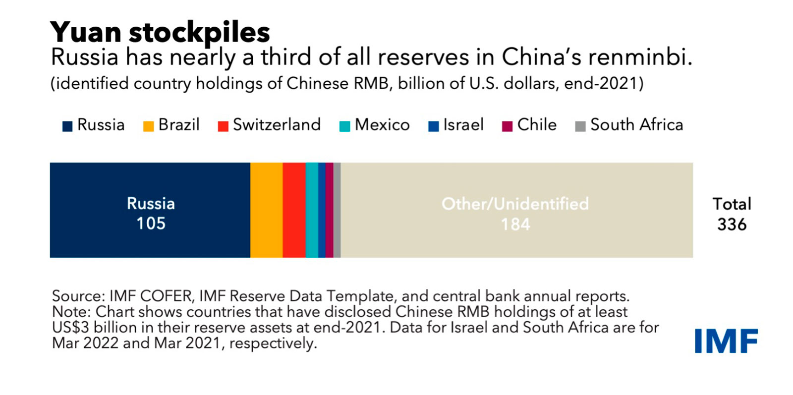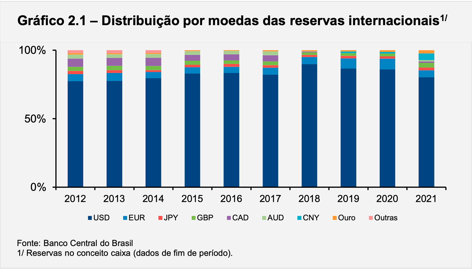 Одновременно с этим Бразилия несколько увеличила резервы в юанях. В 2022 г. Центробанк страны выпустил отчет, согласно которому в 2021 г. доля юаня в резервах Бразилии выросла до 4,99% — в три раза по сравнению с предыдущим годом. Доля доллара составила около 80%, вернувшись к уровням 2012 г. Несмотря на это 90% внешней торговли Бразилии сейчас ведется в долларе. Для сравнения — в 2008 г. юаня не было в резервах страны вообще (возможно, был в 1% «других валют»).
