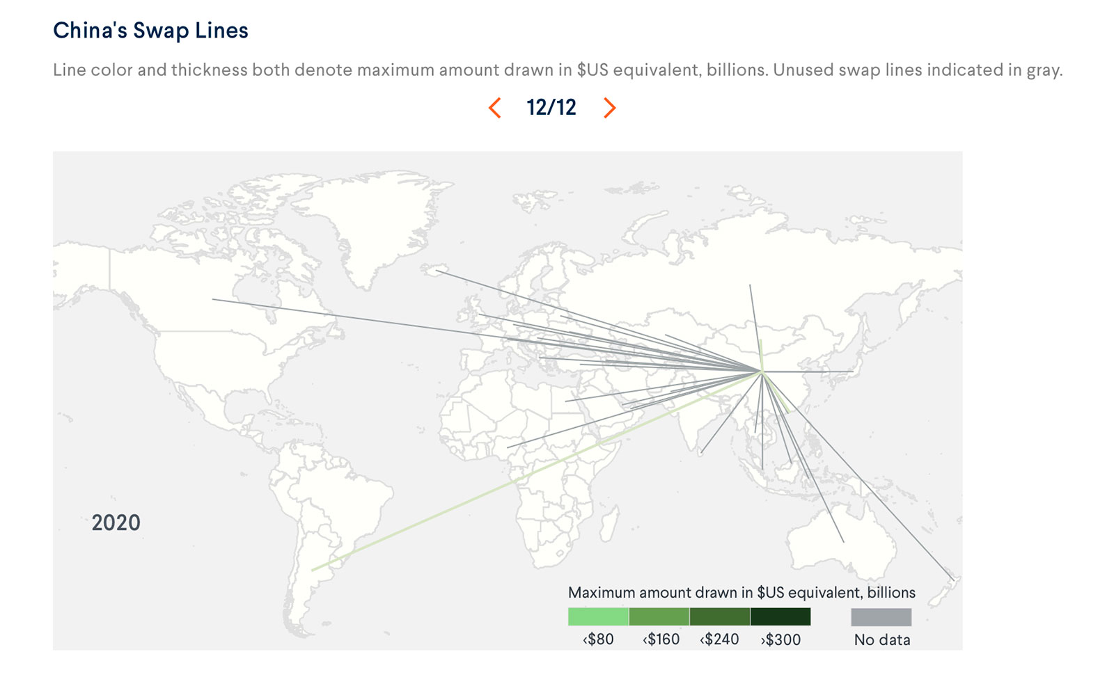 Несмотря на все эти усилия, пока юань не стал серьезной альтернативой доллару в мировой торговле. Из более чем 40 стран, подписавших соглашение о свопах с КНР, воспользовались предоставленной ликвидностью в основном государства с финансовыми трудностями или внешними ограничениями — в разное время активировали своп-линии Пакистан, Россия, Аргентина, Монголия и Украина [1].