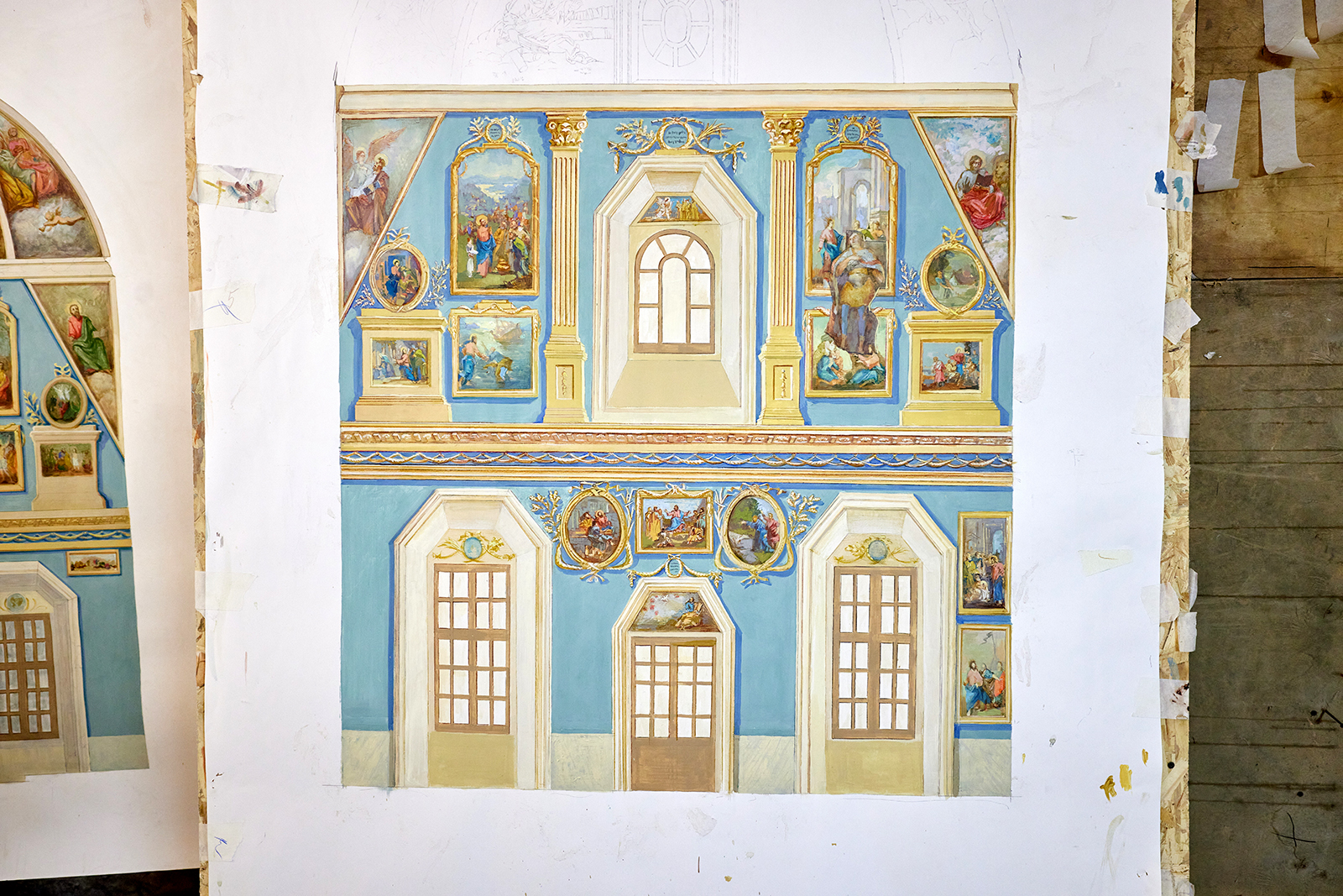 Впрочем, как утверждает Александр Урбанский, эскизы рисуют на плоском картоне, а под куполом живопись ложится на вогнутую поверхность. Нужно учитывать эту особенность, а также заранее представить, как будет смотреться сюжет снизу.