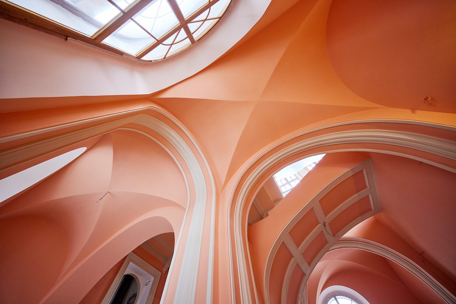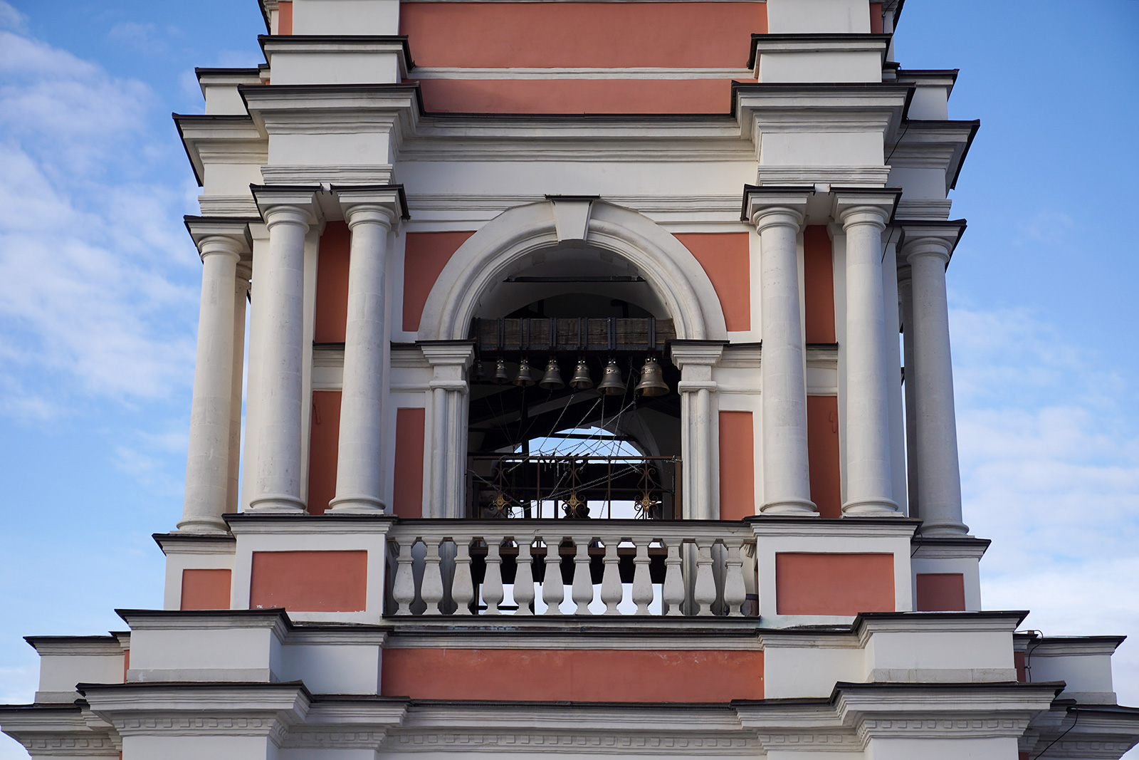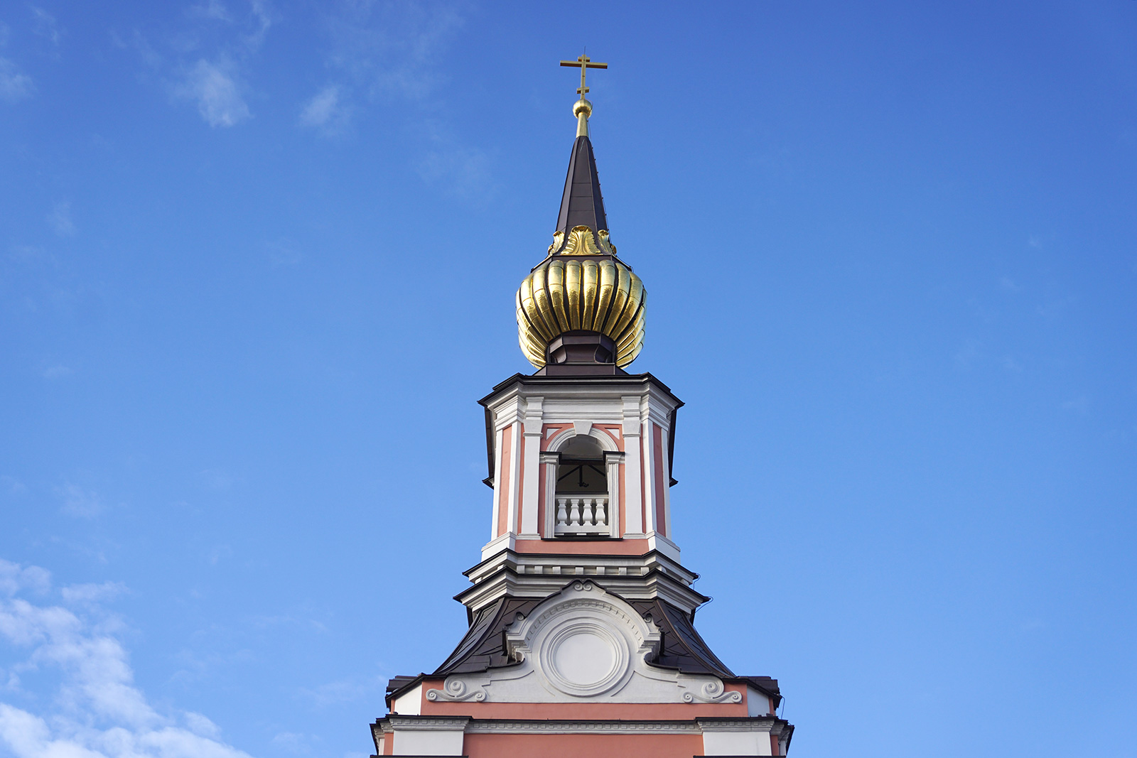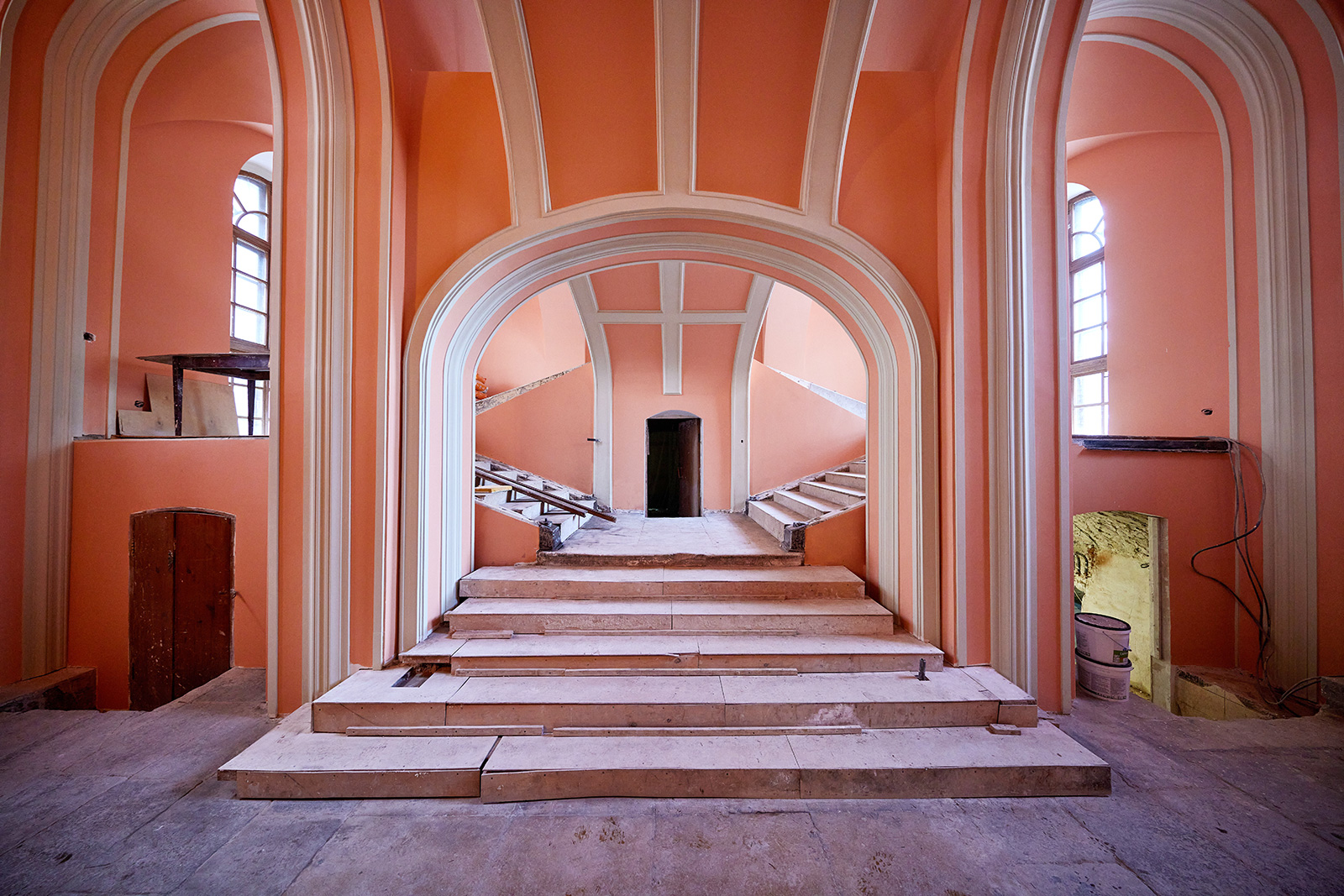 Храм Святых Апостолов Петра и Павла — будто книга в новом переплете: свежий, розовый, с белыми колоннами, наличниками и барельефами. Но пока здесь пахнет краской, во внутреннем дворике сложены мешки со шпаклевочной смесью, и со всех сторон доносится жужжание и стук.