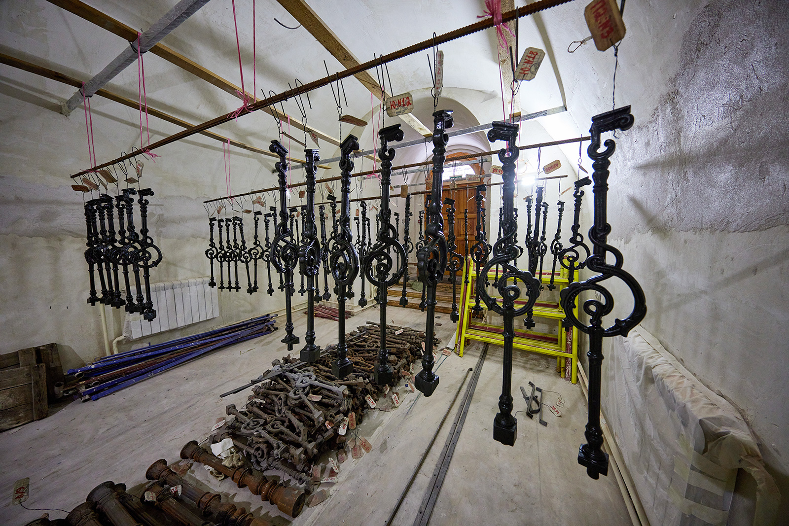 «Лестница построена в XVIII веке и тоже нуждается в реставрации. Пока мы только расчистили балясины, сделали грунтовку и выбрали краску: будет темный серо-графитовый оттенок. Подбором цветов всегда занимается Сергей Куприянов, исходя из сочетаемости, исторической достоверности и собственного видения», — поясняет Александр Урбанский.