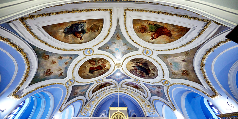 А в нижнем храме, где пахнет свежей штукатуркой, почти все готово: яркая роспись, бело-голубые оконные ниши, позолоченная лепнина в виде листьев и цветов, каменный пол.