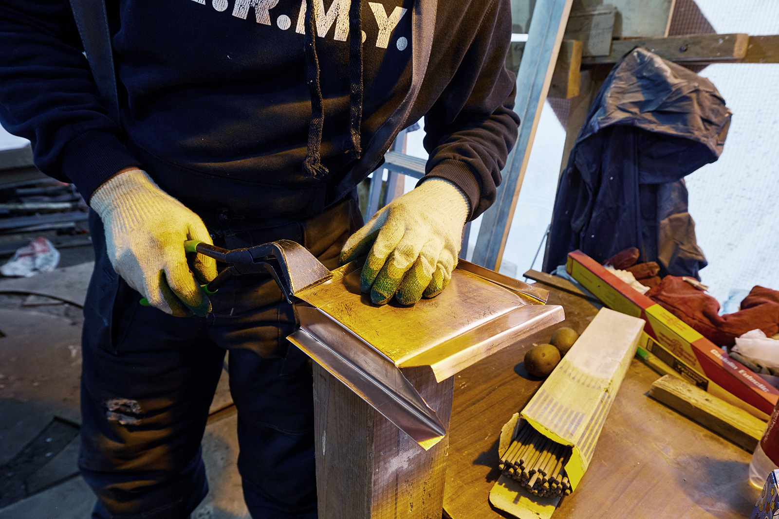 «Этот элемент напоминает крышу, которая оберегает старинный камень от дождя и снега. На медном листе расчерчиваем параметры верхушки столба, затем берем бендер — станок для загибания кромки медного листа, и получается крыша с бортиками, по которым будет стекать вода», — объясняет реставратор Василий Евдошенко. Он работает в мастерской, временно установленной у ограды.