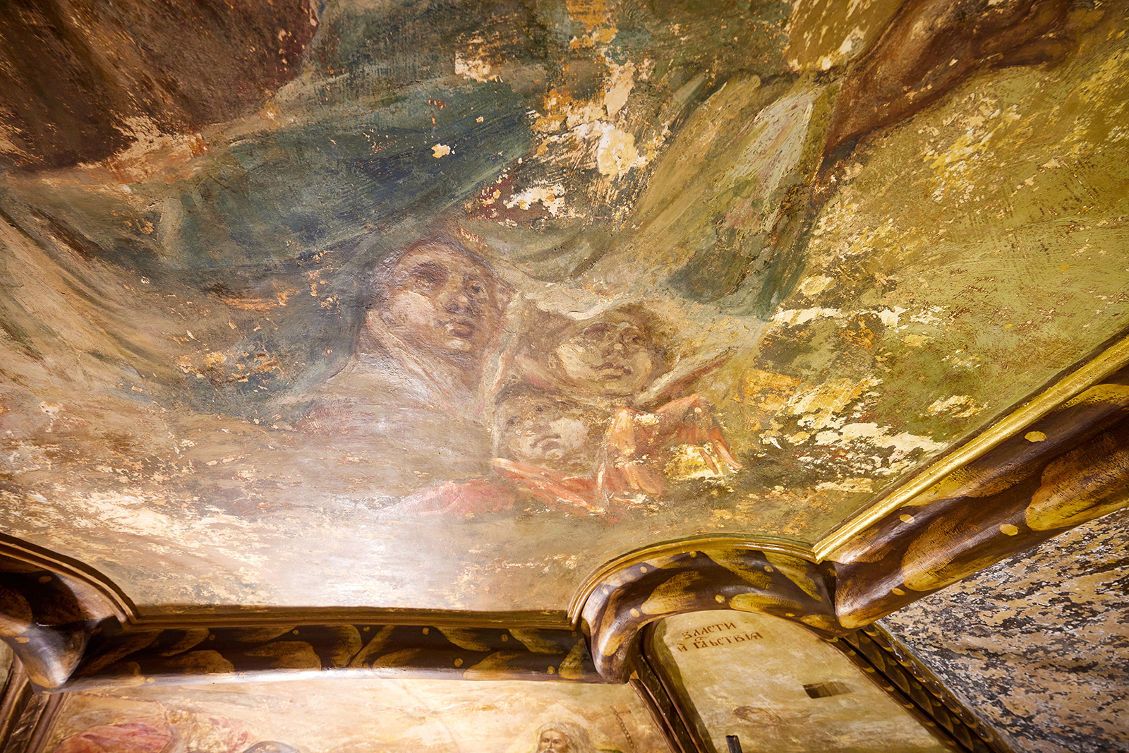 Под куполом, куда мы пробираемся по почти вертикальным лестницам, надев каски, реставраторы нашли под фреской XIX века более древнюю, которая была написана, предположительно, при возведении церкви.