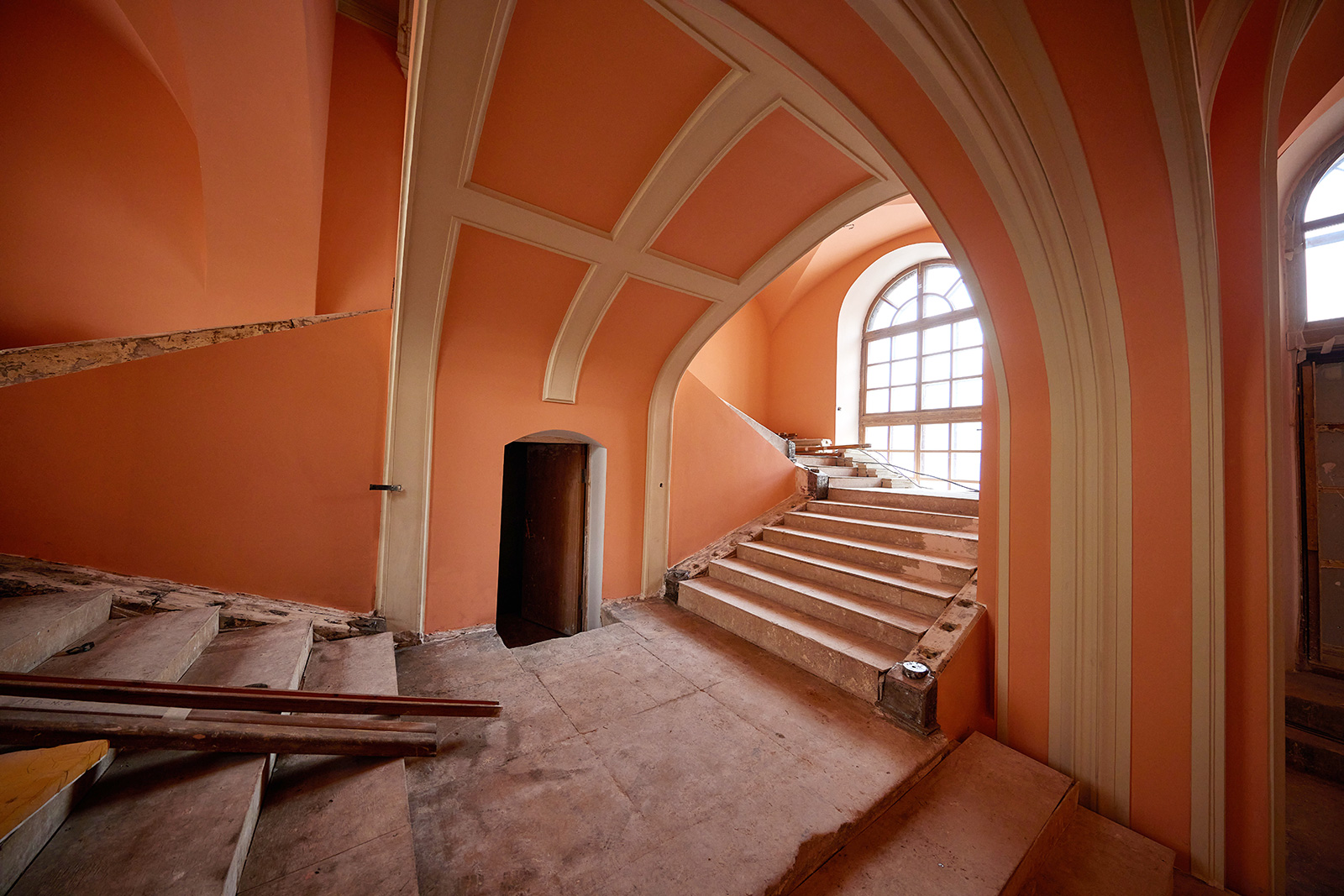 «Лестница построена в XVIII веке и тоже нуждается в реставрации. Пока мы только расчистили балясины, сделали грунтовку и выбрали краску: будет темный серо-графитовый оттенок. Подбором цветов всегда занимается Сергей Куприянов, исходя из сочетаемости, исторической достоверности и собственного видения», — поясняет Александр Урбанский.