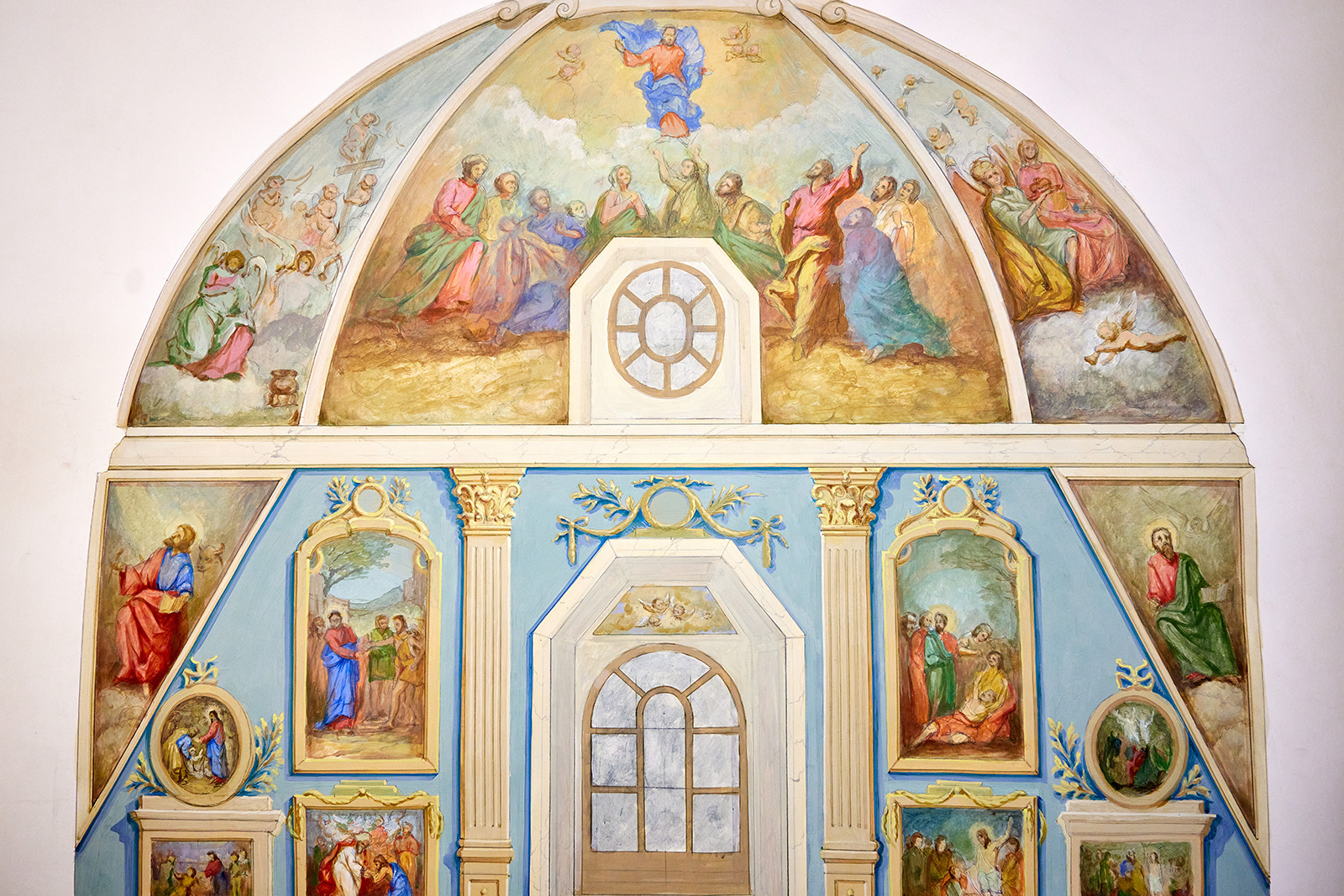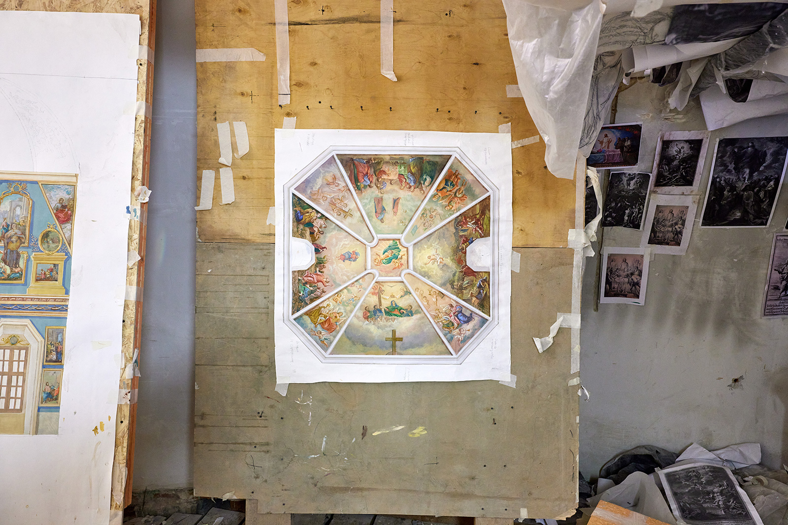 Впрочем, как утверждает Александр Урбанский, эскизы рисуют на плоском картоне, а под куполом живопись ложится на вогнутую поверхность. Нужно учитывать эту особенность, а также заранее представить, как будет смотреться сюжет снизу.