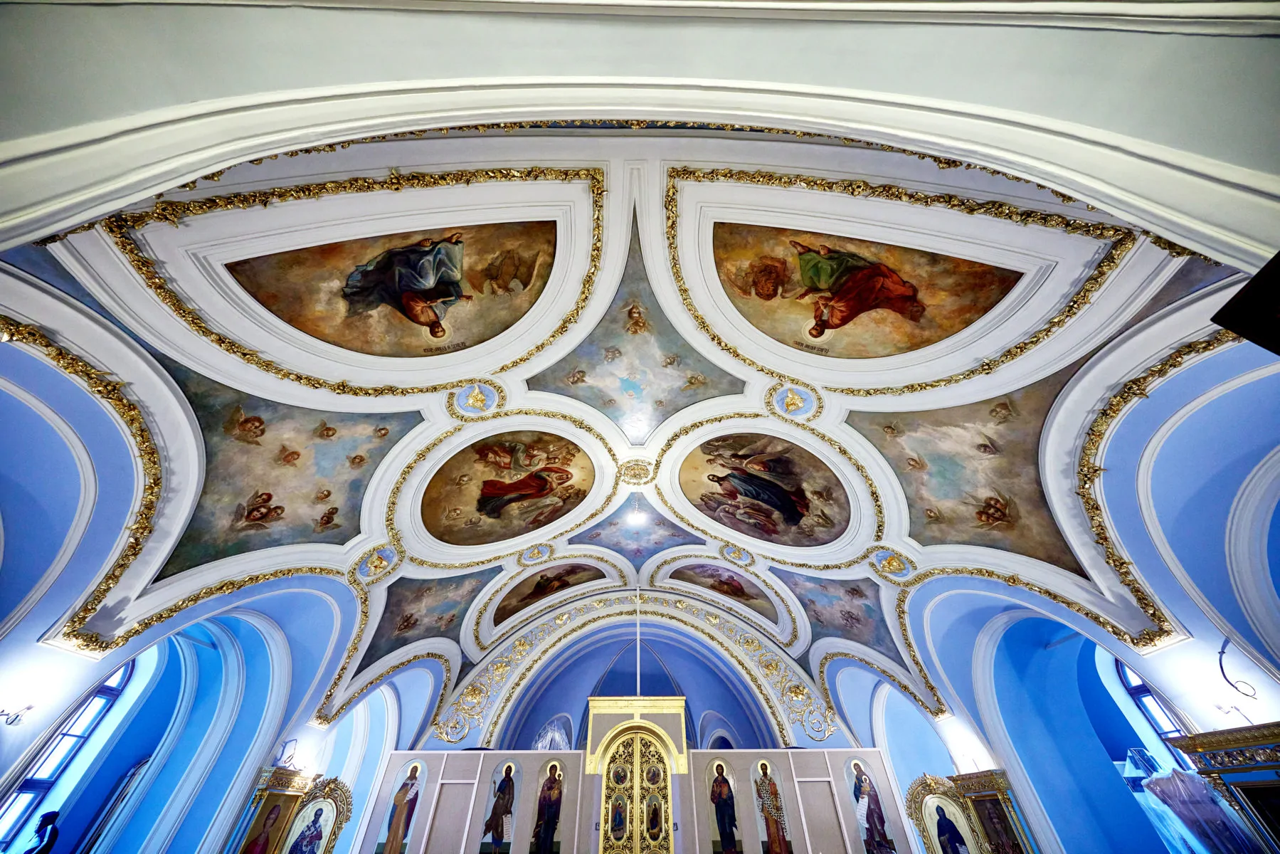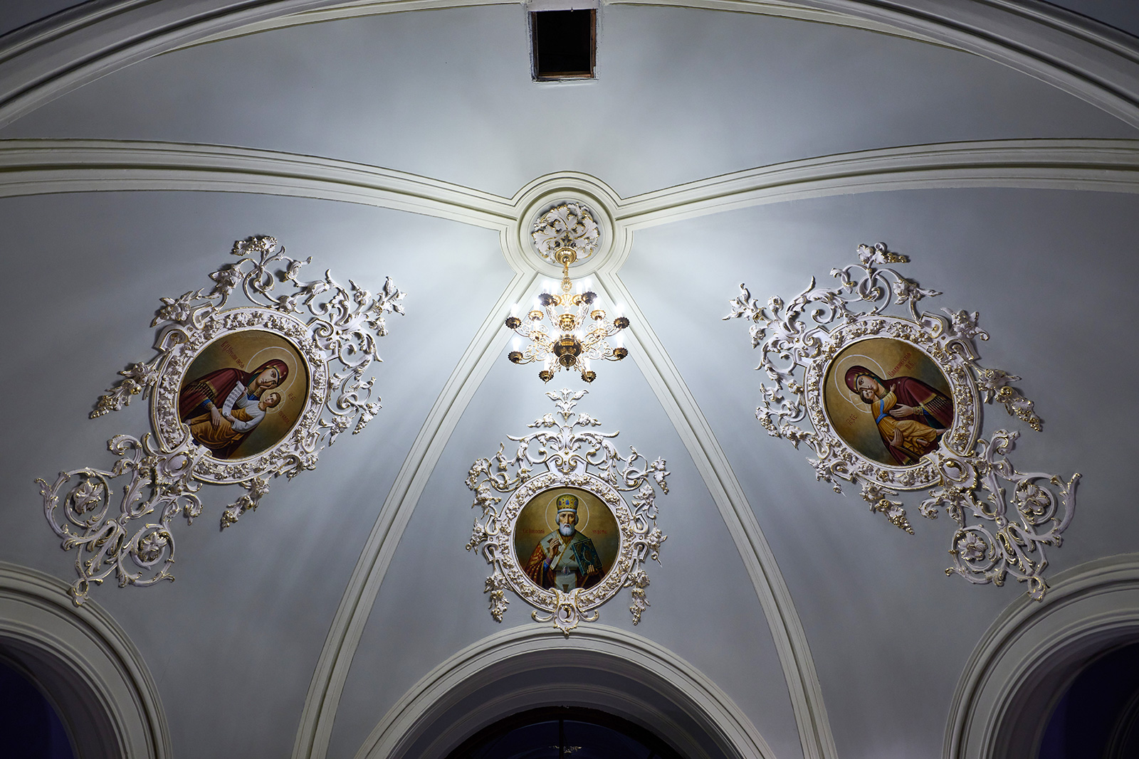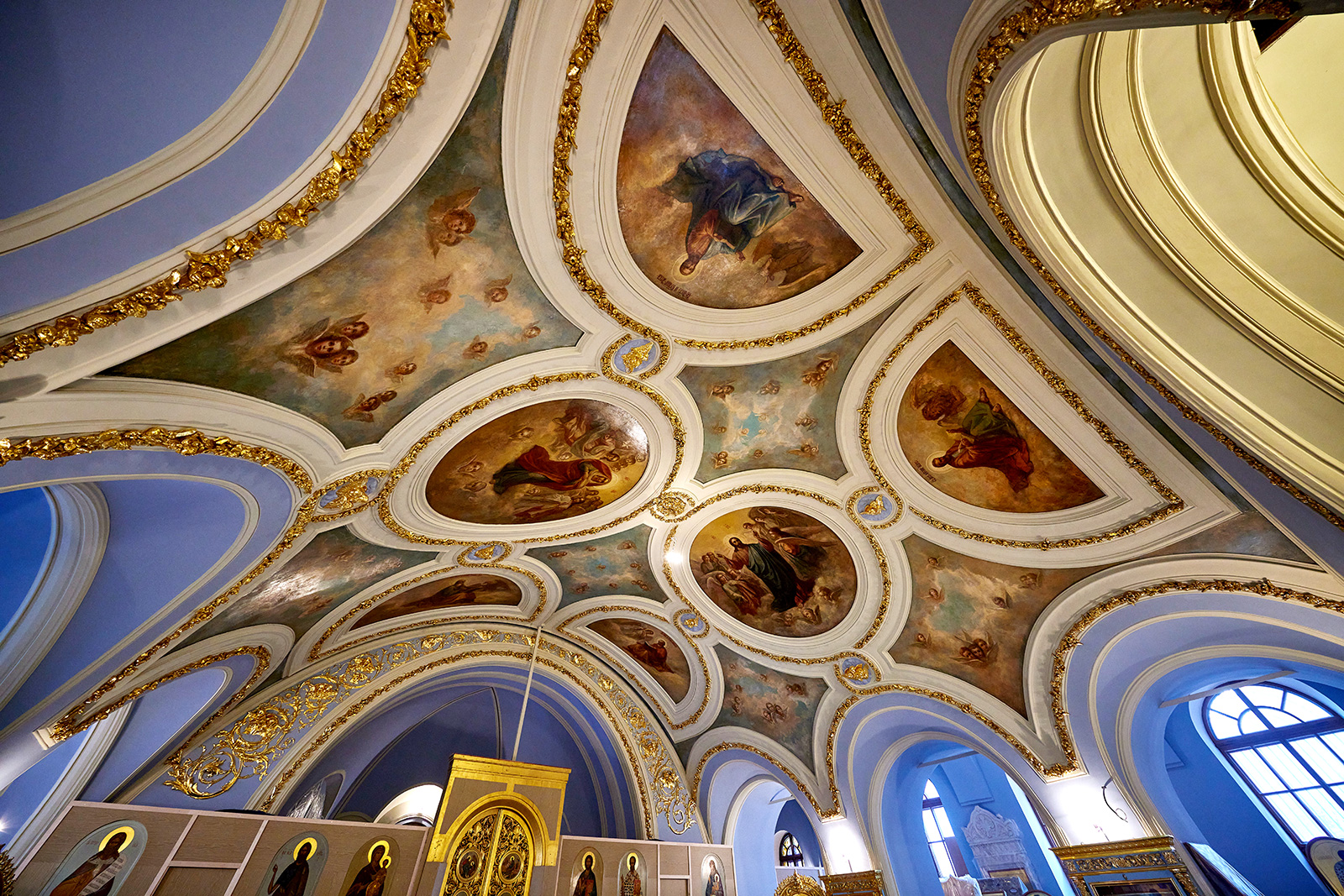 А в нижнем храме, где пахнет свежей штукатуркой, почти все готово: яркая роспись, бело-голубые оконные ниши, позолоченная лепнина в виде листьев и цветов, каменный пол.