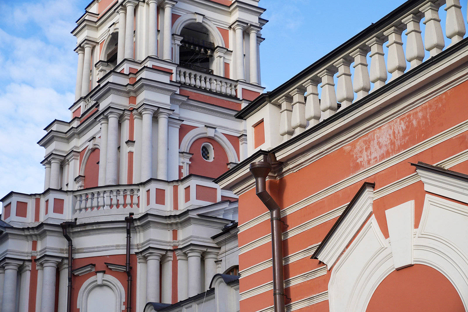 Интересный факт: это была одна из последних каменных построек в Москве. Вскоре царь приказал пустить весь камень на возведение Петербурга. Примерно через 15 лет случился пожар, церковь пришлось серьезно переделать. Еще одну реконструкцию здание пережило в конце XIX века, когда его пытались спасти от сырости. Именно этот последний архитектурный облик в стиле барокко с двумя приделами, нижним Никольским и верхним Петропавловским храмами, а также колокольней дошел до наших дней.