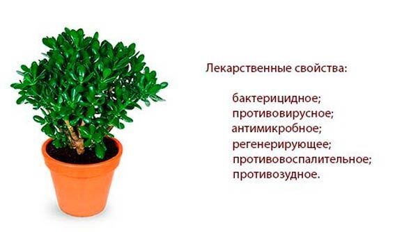 Народные целители издавна используют крассулу в рецептах в виде сока, настоек, кашицы из листьев. Сок содержит немалое количество флавоноидов, благодаря которым денежное дерево является хорошим противовирусным и противовоспалительным средством.