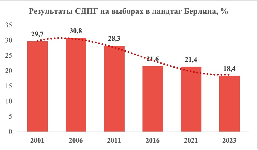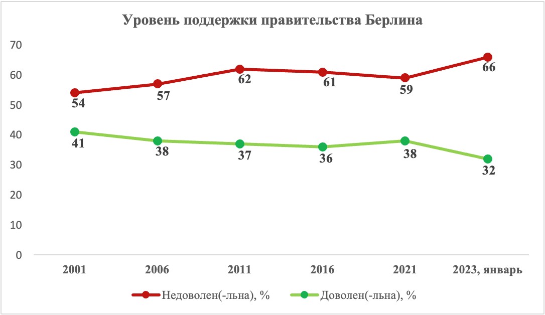 Проигрыш социал-демократов на выборах в ландтаг Берлина расценивают как следствие роста недовольства политикой федерального правительства — с января 2022 г. ХДС стабильно опережает СДПГ в рейтинге электоральных настроений, а с июля по октябрь партия и вовсе опустилась на третье место, уступив «Зеленым». Более вероятным кажется то, что протестное голосование направлено на правящую коалицию в целом, поскольку предвыборные программы партий были сосредоточены прежде всего на решении чувствительных для берлинцев проблем в области безопасности, обеспеченности жильем и его доступности, транспортной мобильности и т.д.