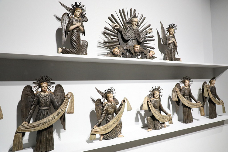 Кроме того, в экспозиции представлены фигуры святого Николая, апостолов, ангелов с символами страстей, сюжеты «Распятие» и «Положение во гроб». Каждому из них будет выделено отдельное пространство для осмысления, ведь оба из них занимали свое место в храме и в сознании прихожан. Особое внимание в экспозиции уделено скульптурам «Христос в темнице», или так называемому «Спасу полунощному» – одному из самых трагичных и загадочных сюжетов русской деревянной скульптуры. Сохранившиеся архивные фото, представленные на выставке, откроют интересные подробности бытования скульптур в храме, например, то, как скульптуру одевали.