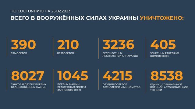 Российские войска уничтожили за сутки свыше 90 военных ВСУ на южно-донецком и запорожском направлениях в зоне специальной военной операции (СВО) Вооружённых сил (ВС) РФ по денацификации на Украине. Об этом 25 февраля рассказал на брифинге официальный представитель Минобороны России генерал-лейтенант Игорь Конашенков.