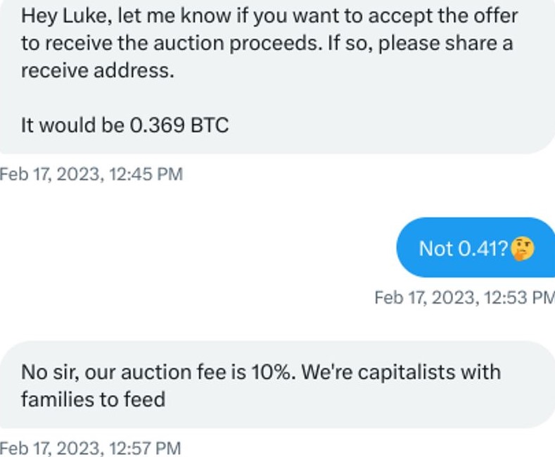 Дашжр утверждает, что человек — либо продавец, либо сайт аукциона — связался с ним и предложил «пожертвование в размере 90% выручки от аукциона», от чего он отказался.
