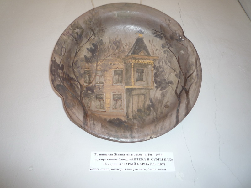 — Это моя работа из серии «Старый Барнаул» — декоративное блюдо «Аптека в сумерках» (1978). Выйдя замуж за живописца-графика Андрея Григорьевича Вагина, я несколько лет прожила в Барнауле. Конечно же, много работала, сделала множество работ старого города. Это — одна из них. Меня привлекло это здание. С правой стороны — гора, дорога в гору ведёт в посёлок. А тут эта аптека, вся какая-то отдалённая от цивилизации, — вспоминает Жанна Анатольевна Травинская, наша знаменитая художник, график, керамист.