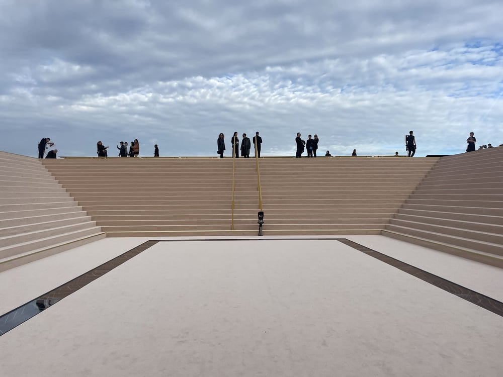 Весь этот счастливый маленький мир затем переместился в огромное здание с золотыми стенами и пудрово-розовым ковром, подготовленным специально для показа. Оно выходило на арену, окруженную тремя величественными лестницами, с вершины которых открывался панорамный вид на город.