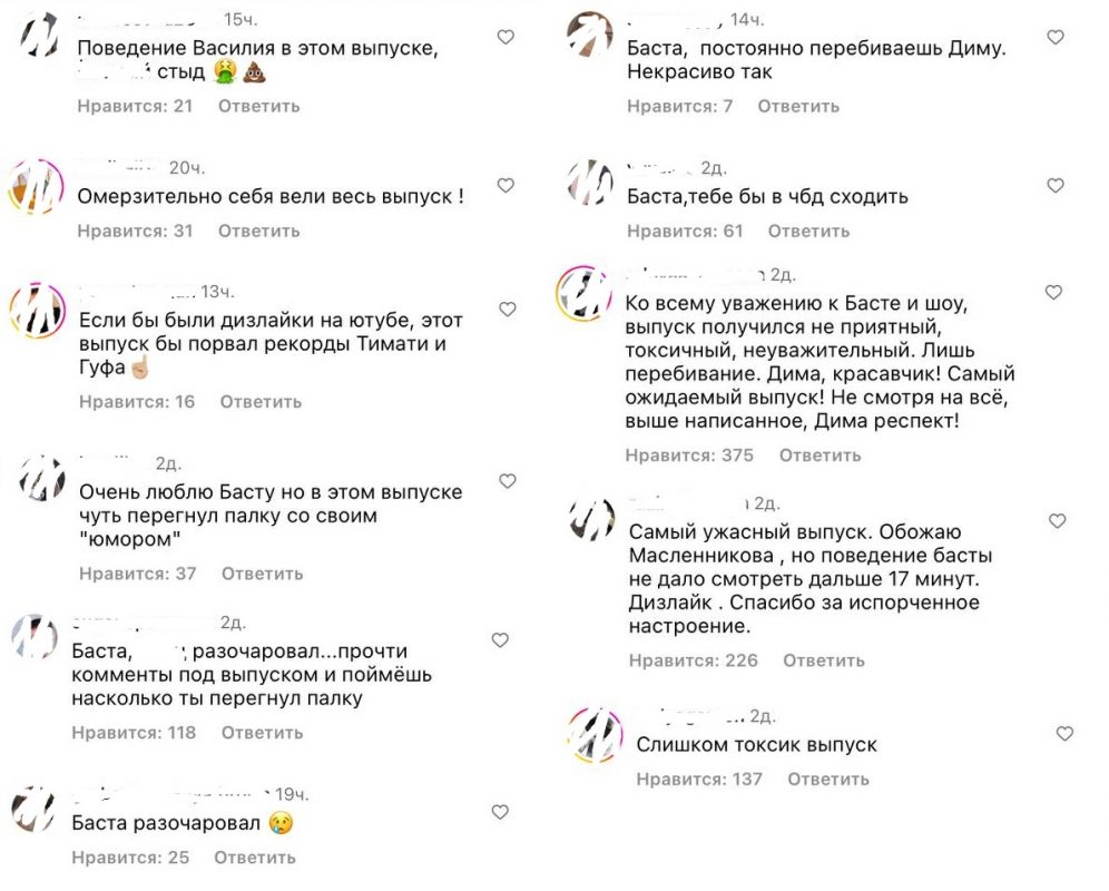 «Ко всему уважению к Басте и шоу, выпуск получился неприятный, токсичный, неуважительный. Лишь перебивание. Дима, красавчик!», «Самый ужасный выпуск. Обожаю Масленникова, но поведение Басты не дало смотреть дальше 17-ти минут. Дизлайк. Спасибо за испорченное настроение», «Слишком токсик выпуск», «Баста разочаровал», «Момент, когда Баста шутит, и никто не смеется – как отдельный вид искусства», - написали они в комментариях.